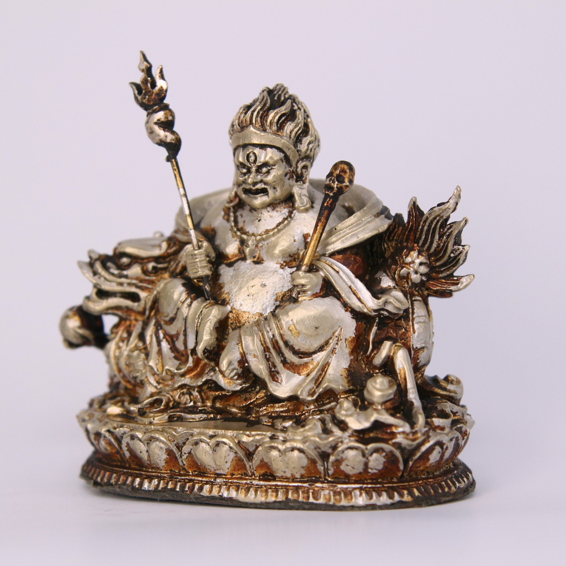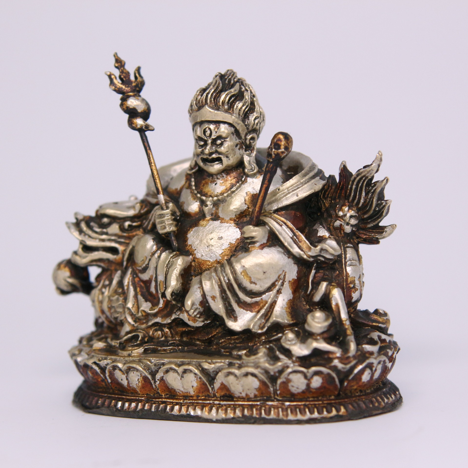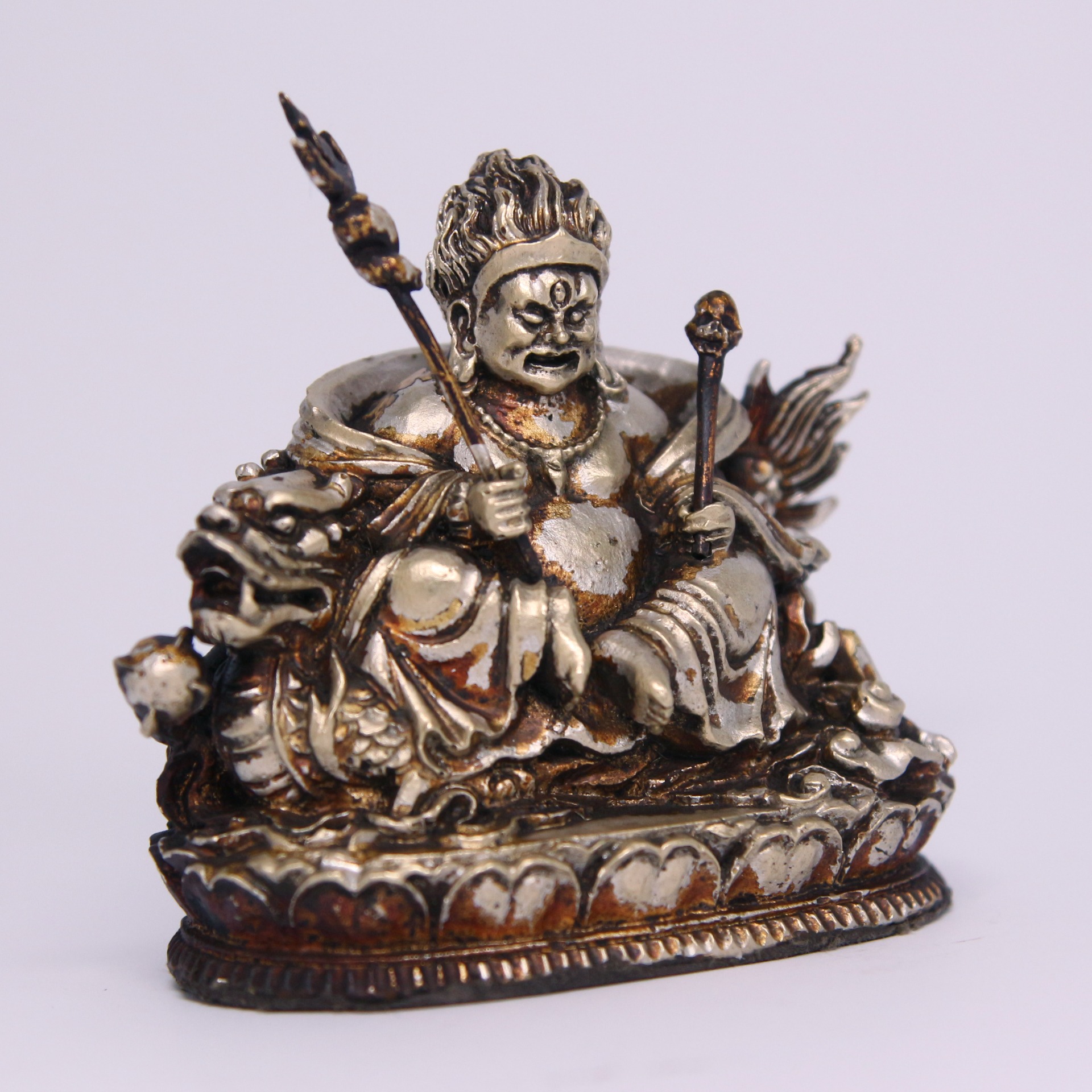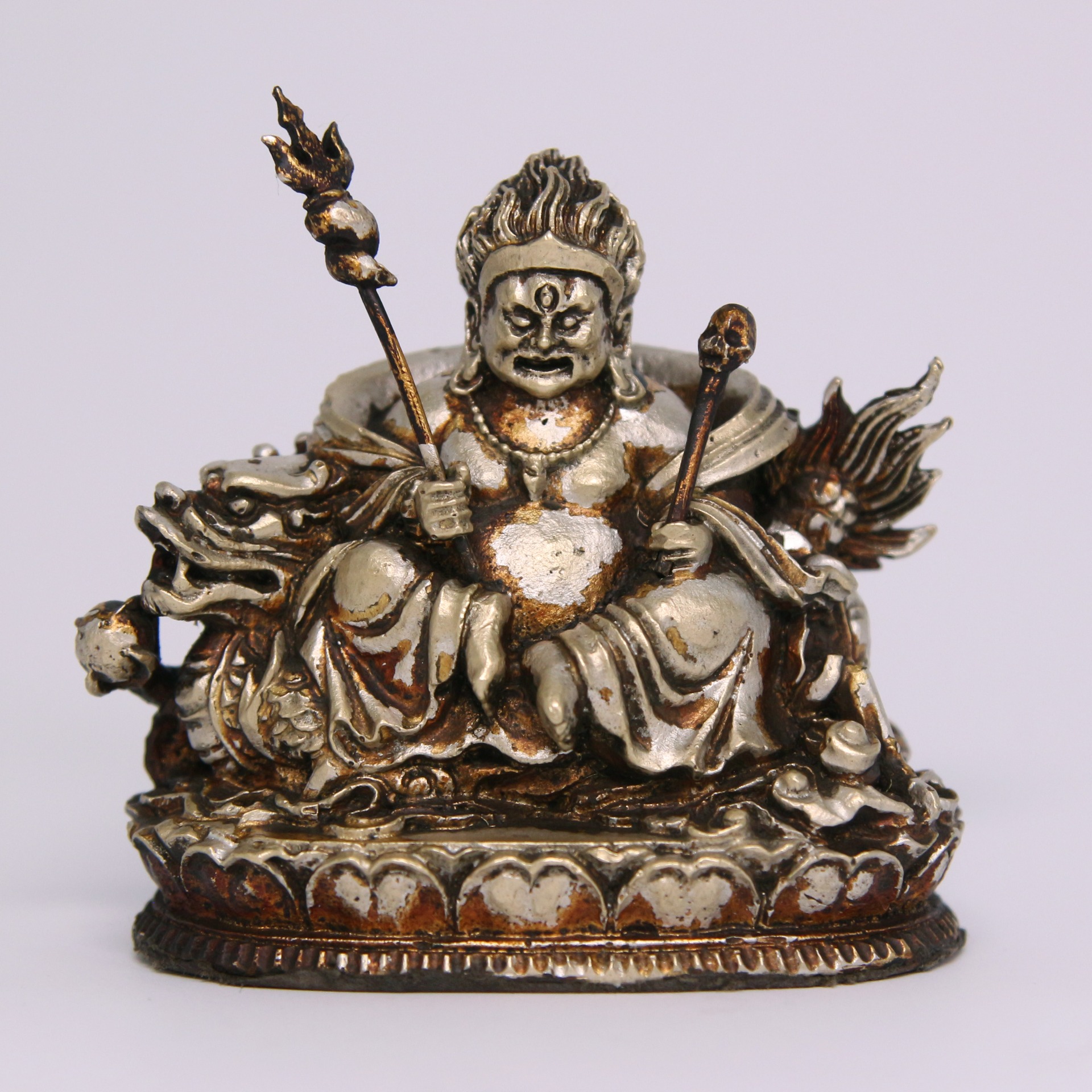 最具特色的是白財神坐騎於氣勢昂揚的龍上——龍象徵至尊威權與護法力量,寓意鎮守財富、驅逐不祥。整件作品底座以蓮瓣紋雕飾,象徵清淨與福德圓滿。銀胎鍍金的小型造像罕見精巧,是一件集信仰意涵與工藝美感於一體的珍貴護法財神像。