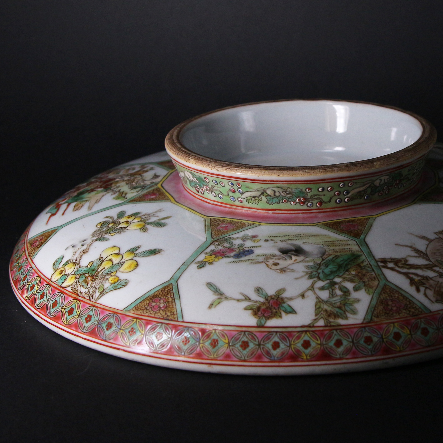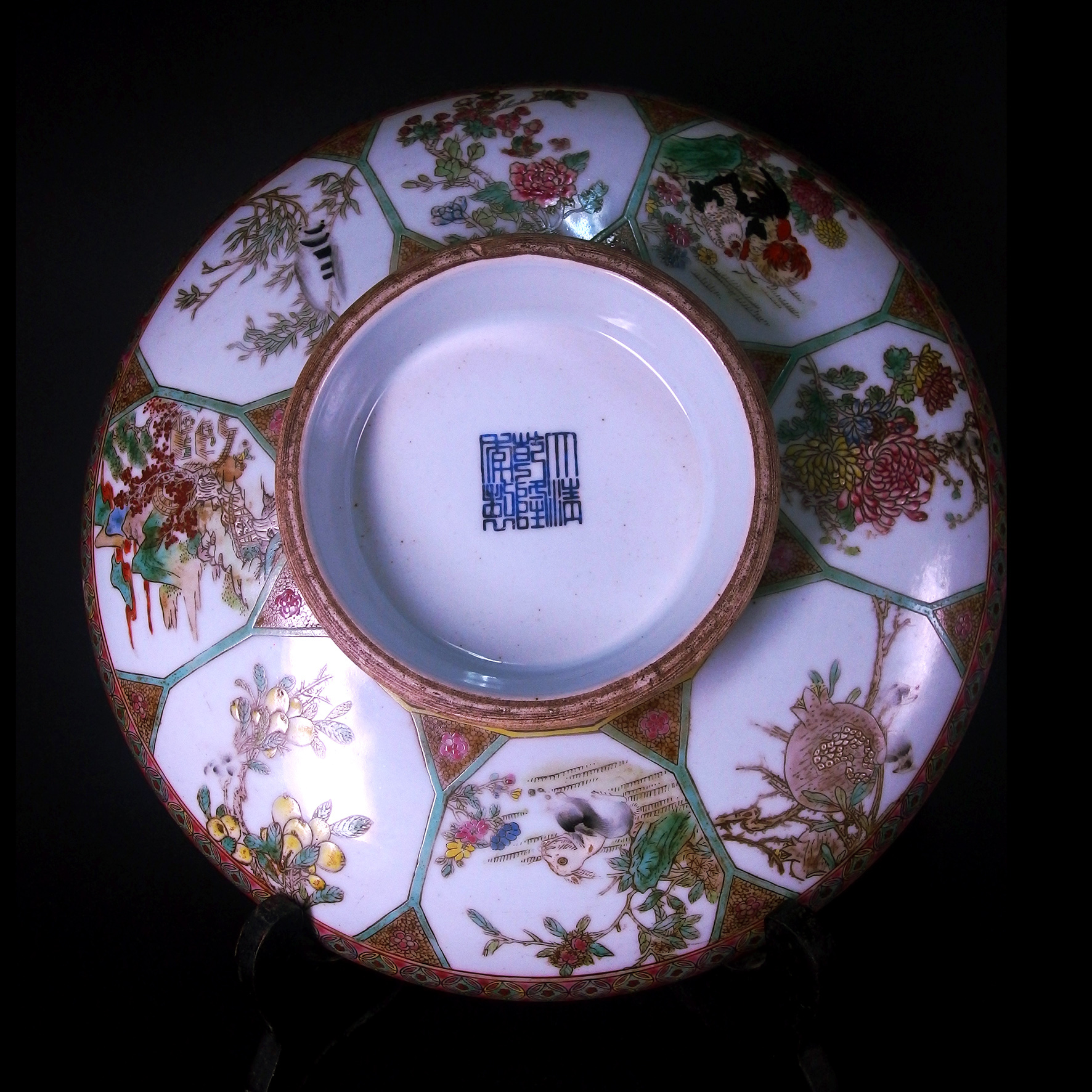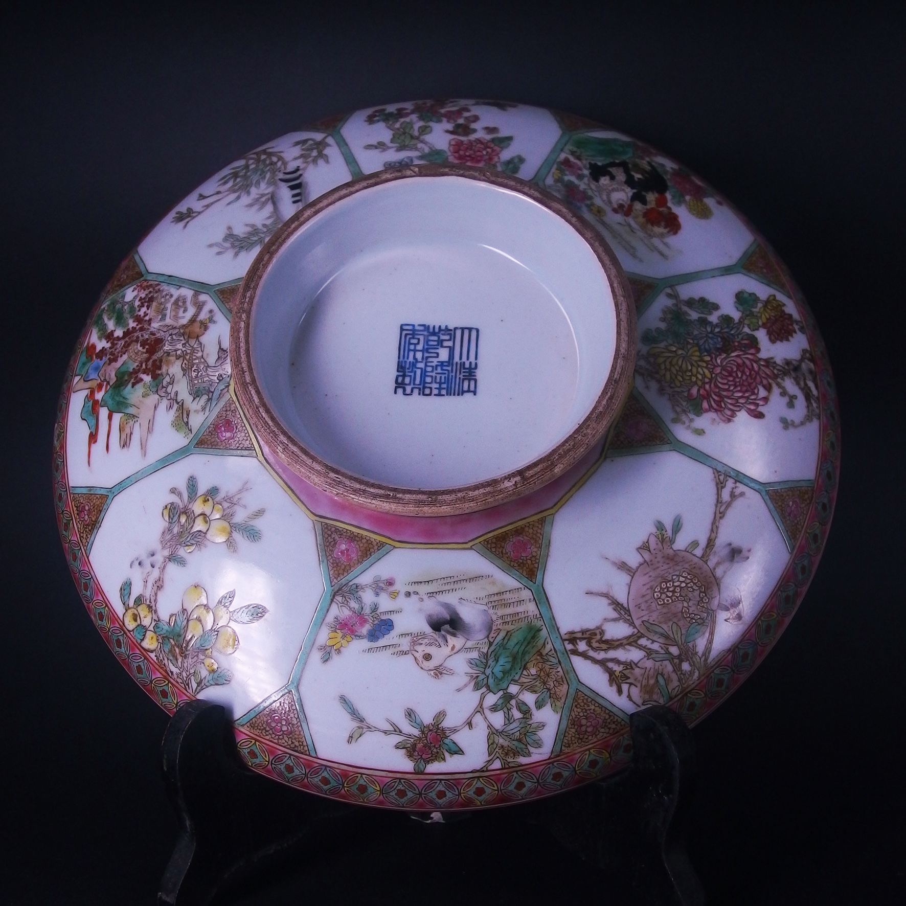 盤子背面(底足)同樣施以粉彩,裝飾有六角形開窗,內繪花卉、雀鳥或吉祥圖案,層次感豐富。最關鍵的是底足中央的藍色方章款,雖然照片上字體略顯模糊,但根據形制與民國時期對清代官窯的慕古之風,此類款識常見為「乾隆年製」或「大清乾隆年製」的仿款。在民國時期,景德鎮窯廠常仿製清三代的官窯器,特別是華麗的粉彩器,以滿足當時市場需求。因此,結合其繁縟的開窗佈局、濃豔的粉彩風格以及仿製的底款,此盤應為民國時期燒造的慕古佳作。