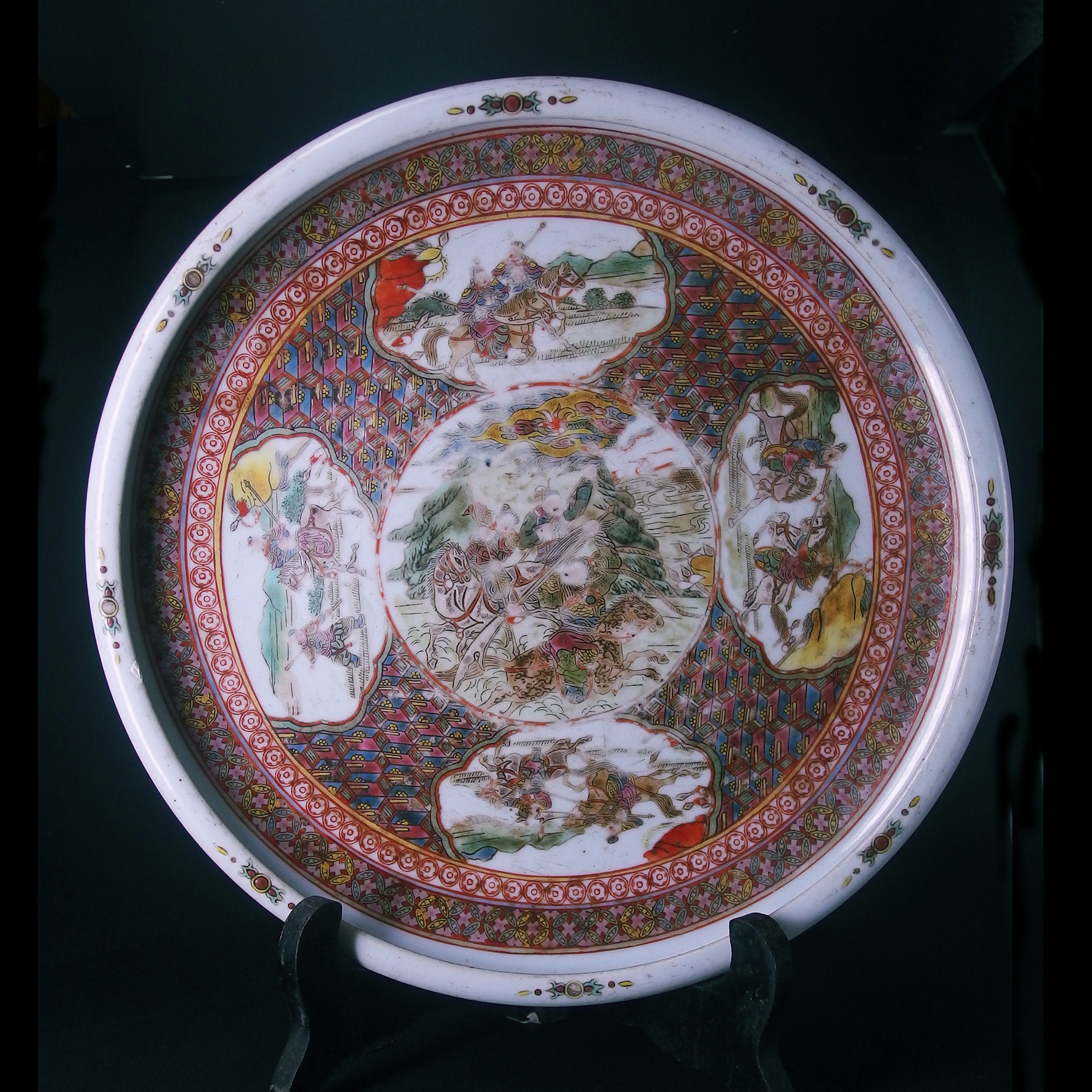 這件民國時期的開窗粉彩人物貢盤展現了民國瓷器傳承與創新的特色。盤面以精細的粉彩技法繪製,其最大的特點是採用了開窗的裝飾佈局。中央和四個主要菱形或團狀開窗內,生動描繪了古代人物故事或戰爭場面,人物眾多,姿態各異,具有戲劇性的敘事性,可能取自歷史小說或傳奇故事。開窗的周圍則飾以密集的幾何紋、團花紋或錦地,色彩豐富豔麗,凸顯了中央和開窗內圖案的主體。