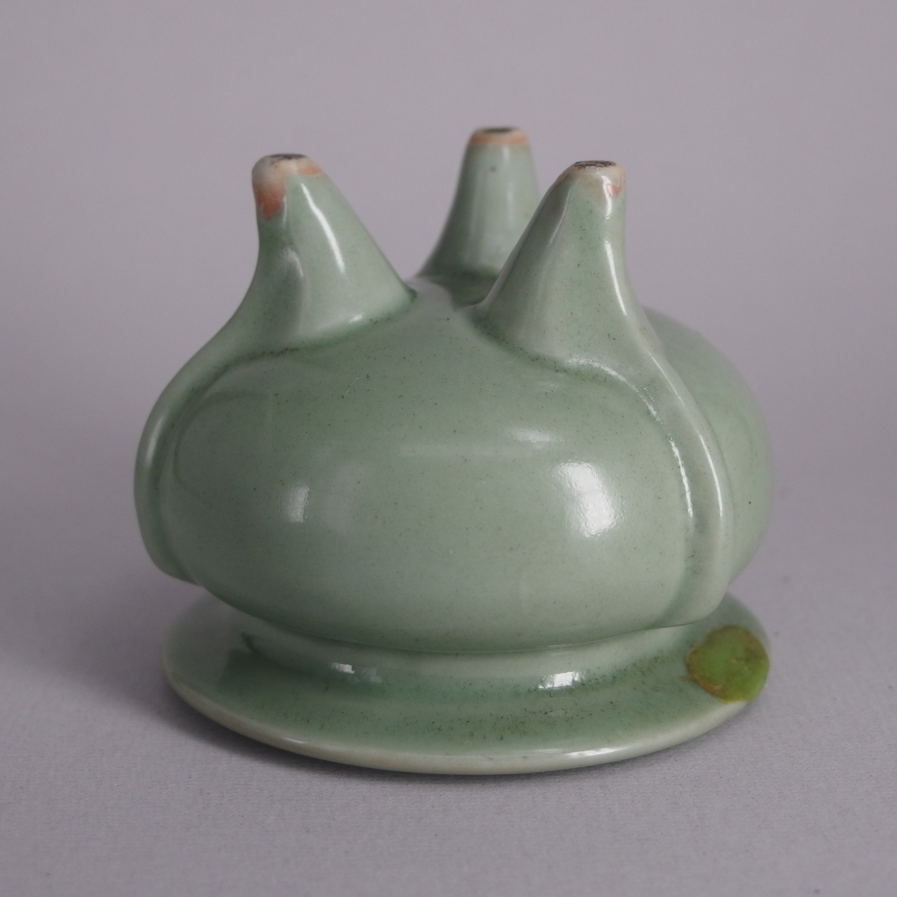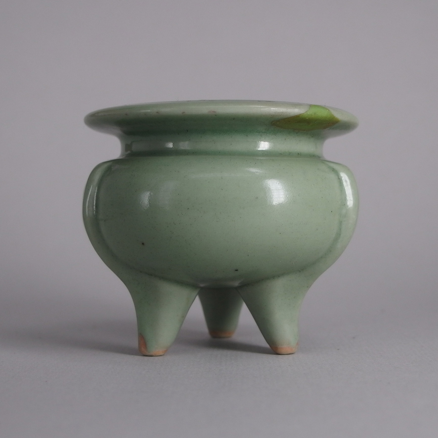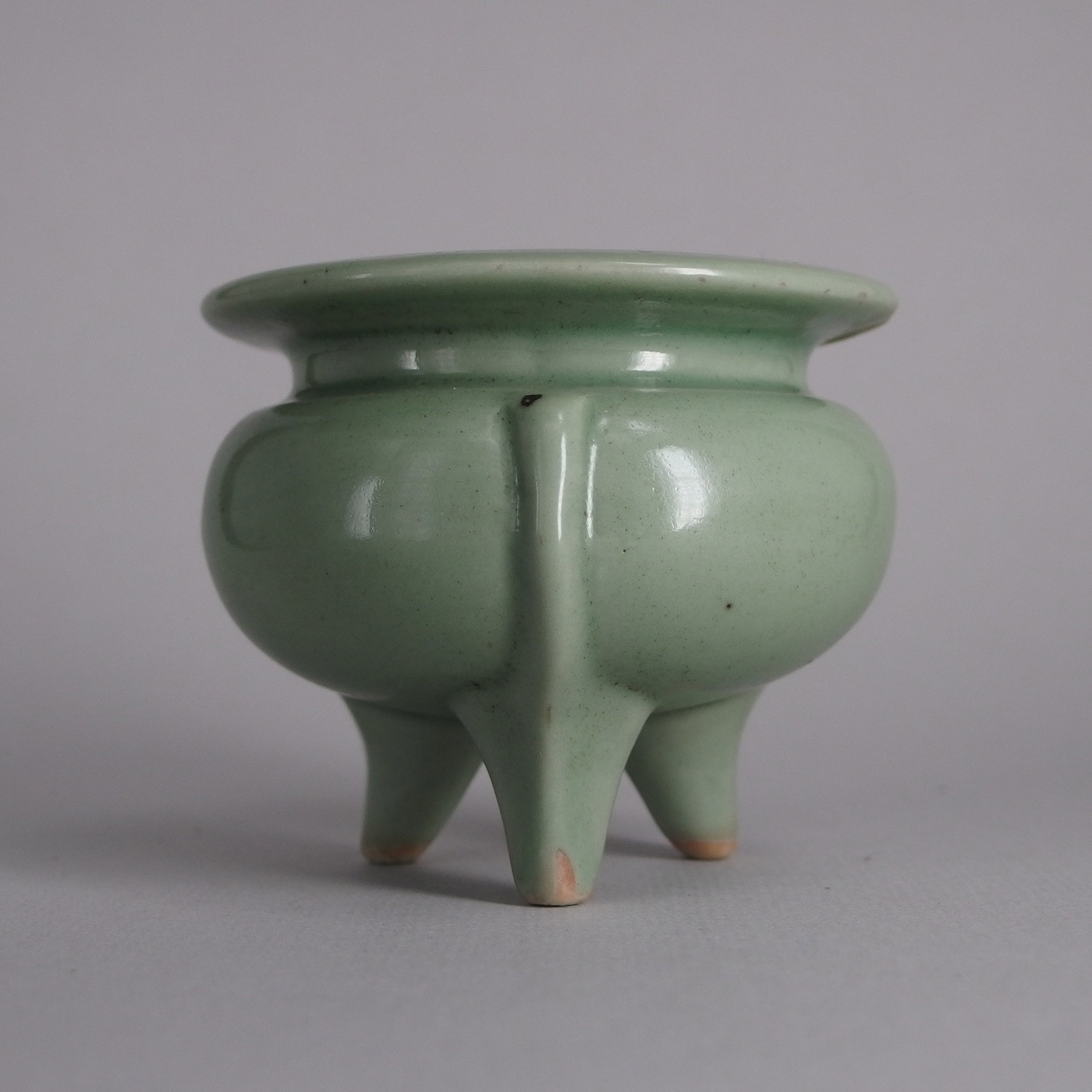 此器為宋代龍泉窯所製梅子青釉鬲式爐,仿古代青銅器鬲之形制,三足穩健,肩部渾圓,口沿微侈,釉質厚潤。龍泉窯為南宋著名青瓷窯口,所產梅子青釉色因似初熟梅實,故名。其釉層厚而光潤,猶如翡翠,為龍泉窯成熟期的代表釉色之一。此爐用於焚香,象徵文人雅趣與生活儀式感,亦具收藏及研究價值。