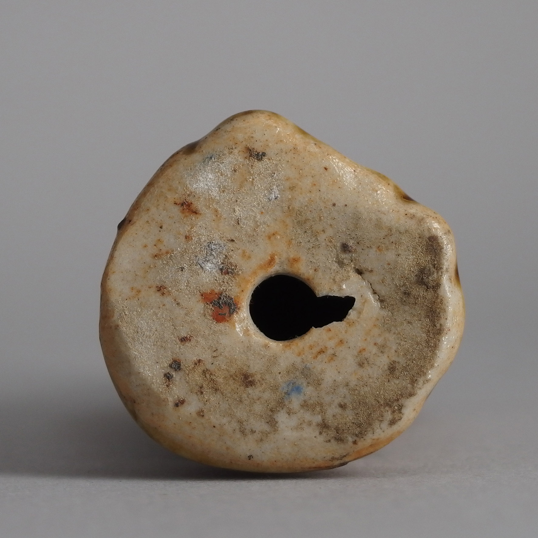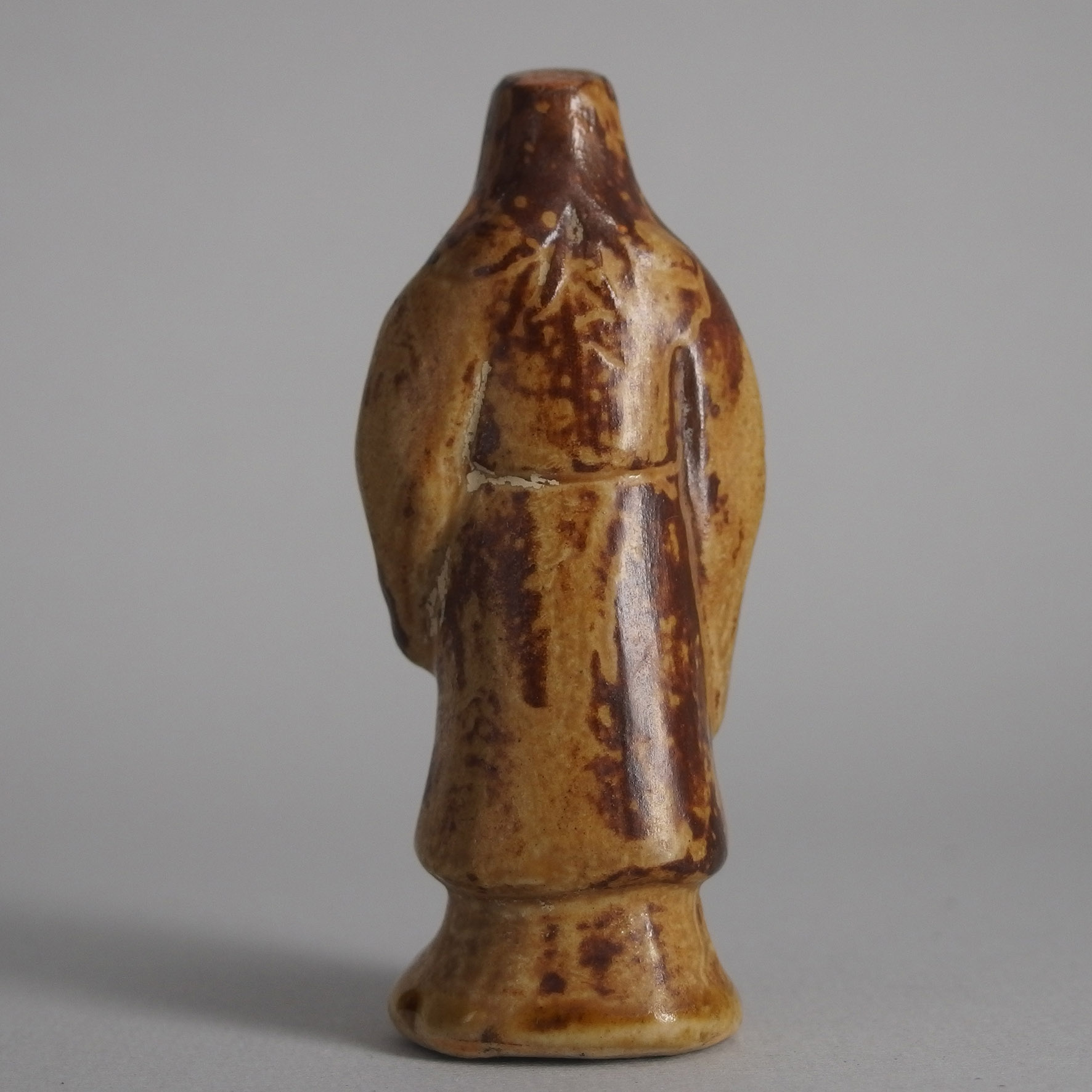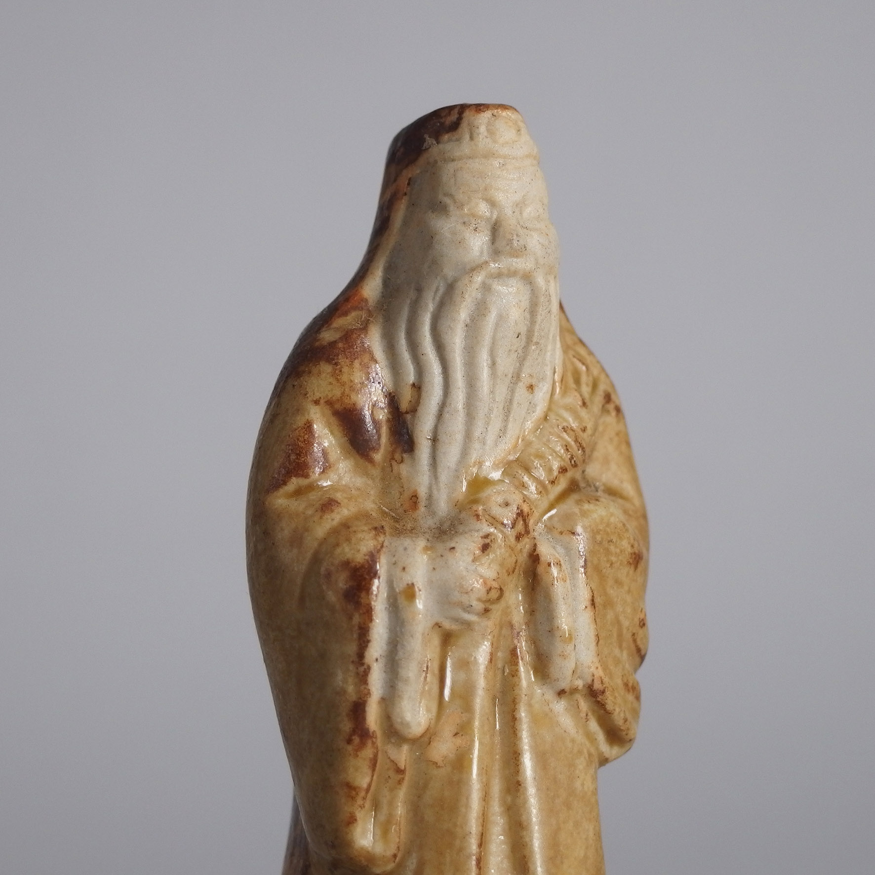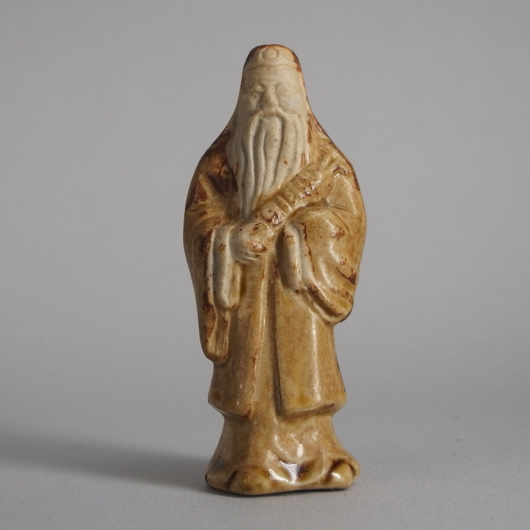 這尊陶瓷小立像是道教八仙之一的曹國舅(曹佾),其身份為宋代國舅,因棄官修道而得道成仙。塑像以其經典形象呈現:一位長鬚老者,頭戴官帽(或頭巾),身著寬袖長袍,雙手持握曹國舅的標誌法器——玉笏或陰陽板(雲陽板)。塑像整體神態沉穩肅穆,體現了人物從權貴轉向仙風道骨的超然氣質。