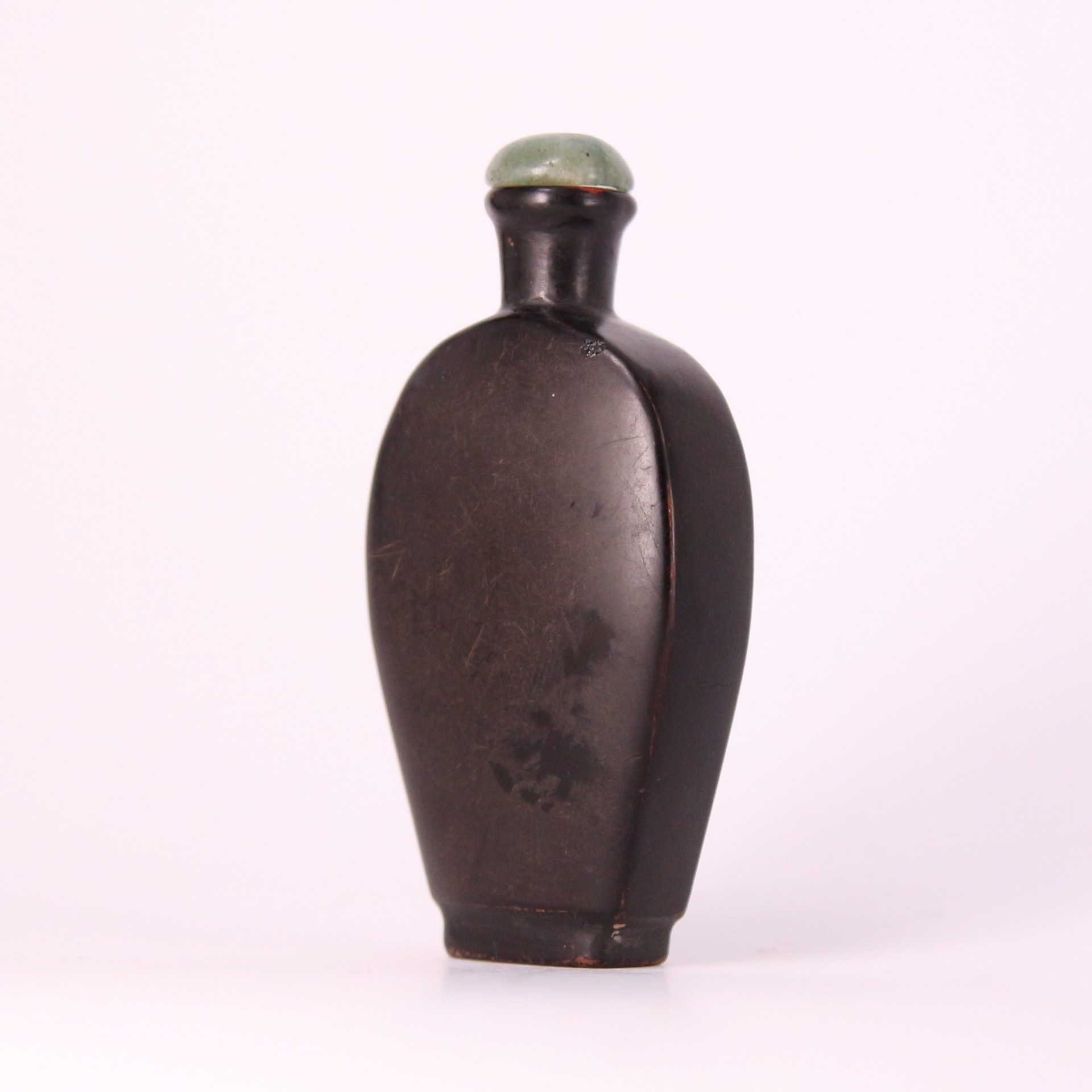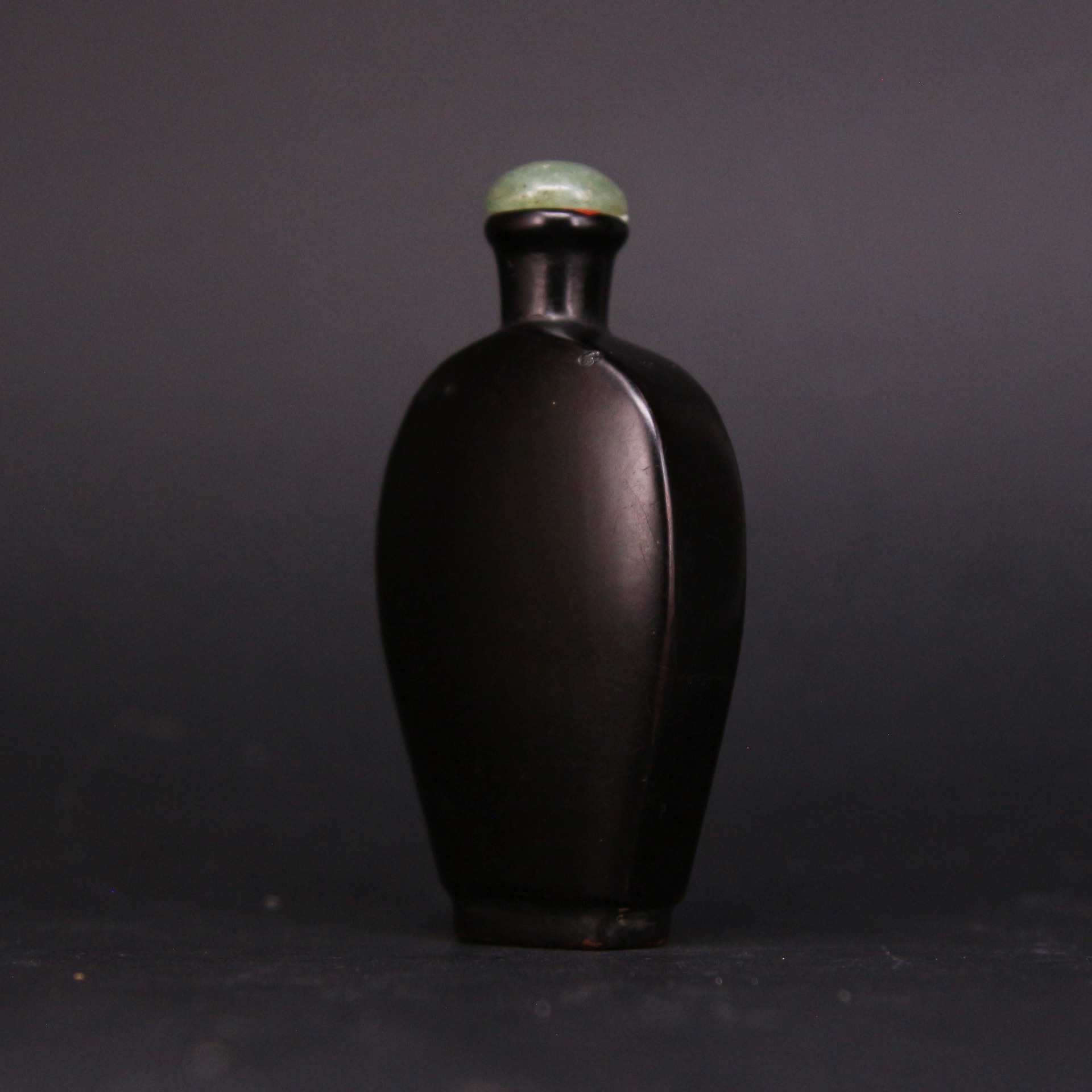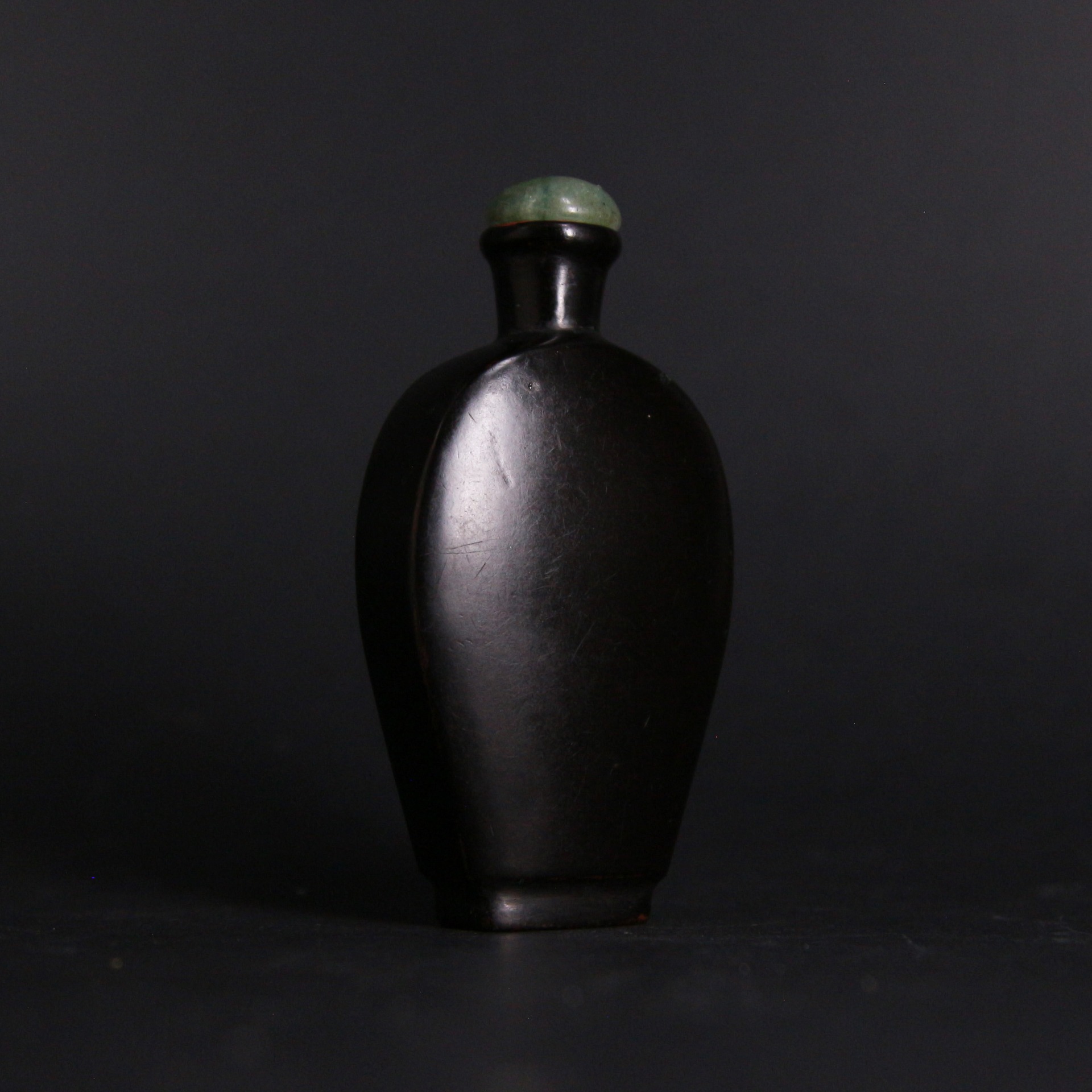此件清代漆器鼻煙壺以深沉烏黑的漆色呈現極簡而穩重的美感,瓶身線條圓潤、輪廓簡潔,呈現清代中晚期鼻煙壺追求素雅與質感的風格。表面經多層髹漆反覆打磨而成,帶有柔和光澤與細緻手感,底部與肩部略見歲月磨痕,更添古雅韻味。瓶口配置青綠色壺蓋,使深黑漆身與溫潤色調形成雅致對比。
