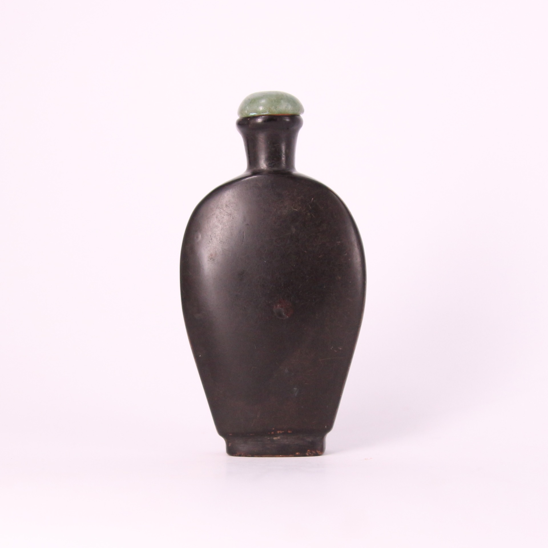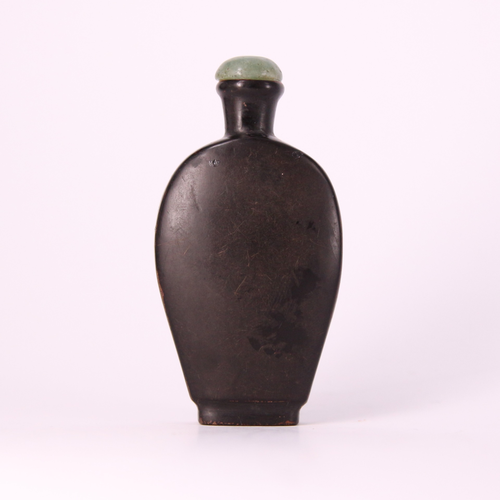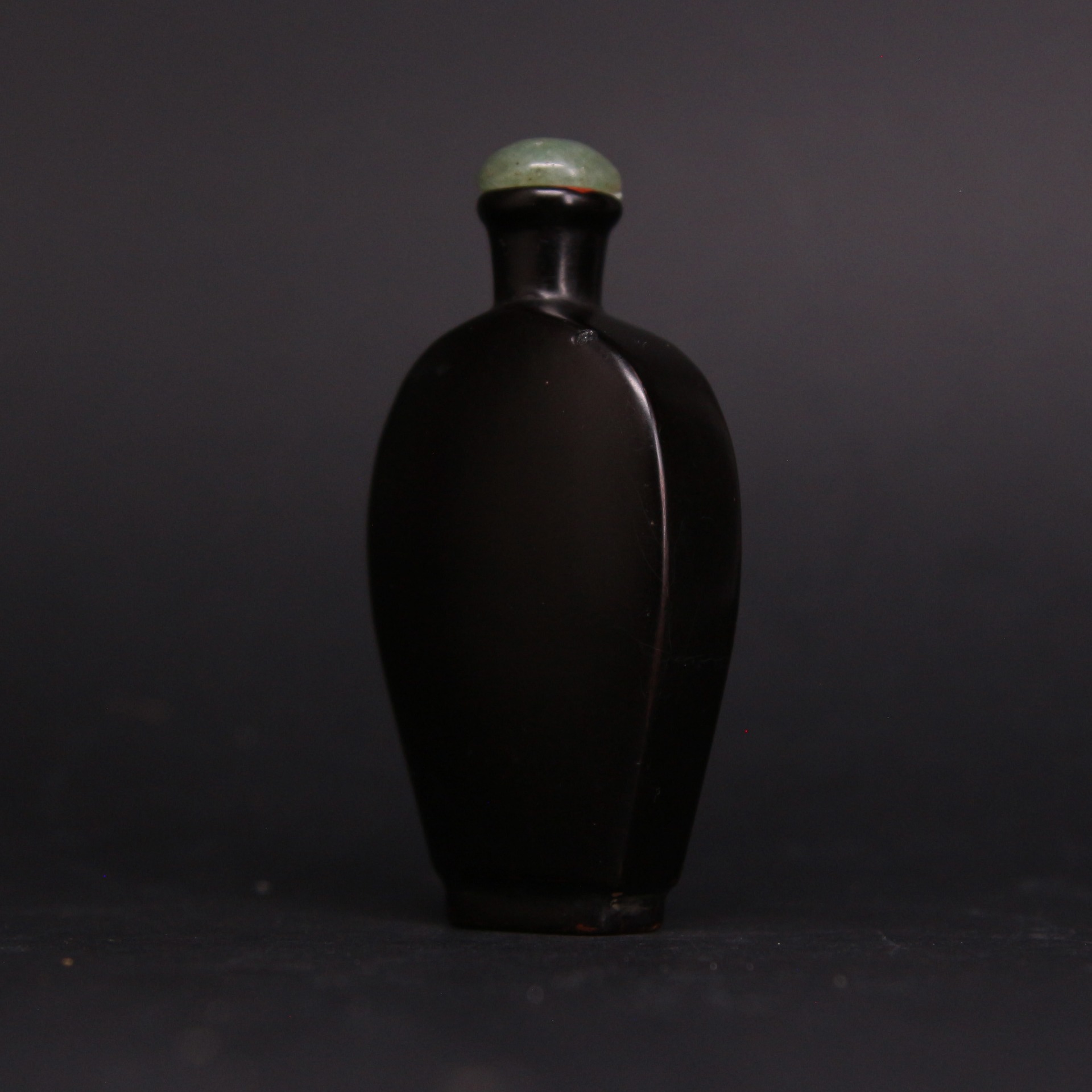 此件清代漆器鼻煙壺以深沉烏黑的漆色呈現極簡而穩重的美感,瓶身線條圓潤、輪廓簡潔,呈現清代中晚期鼻煙壺追求素雅與質感的風格。表面經多層髹漆反覆打磨而成,帶有柔和光澤與細緻手感,底部與肩部略見歲月磨痕,更添古雅韻味。瓶口配置青綠色壺蓋,使深黑漆身與溫潤色調形成雅致對比。