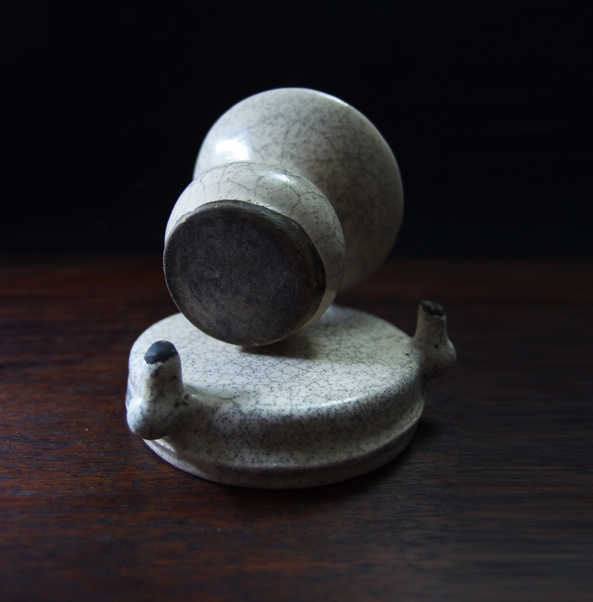 此組文房器為宋代製作,通體溫潤,表面佈滿自然開片,富有古雅之韻。整體由底座與承器兩件組合而成,結構簡潔實用,器形端正穩重。底座設有三足支撐,增添穩定性與觀賞趣味,亦符合傳統文房器具設計。