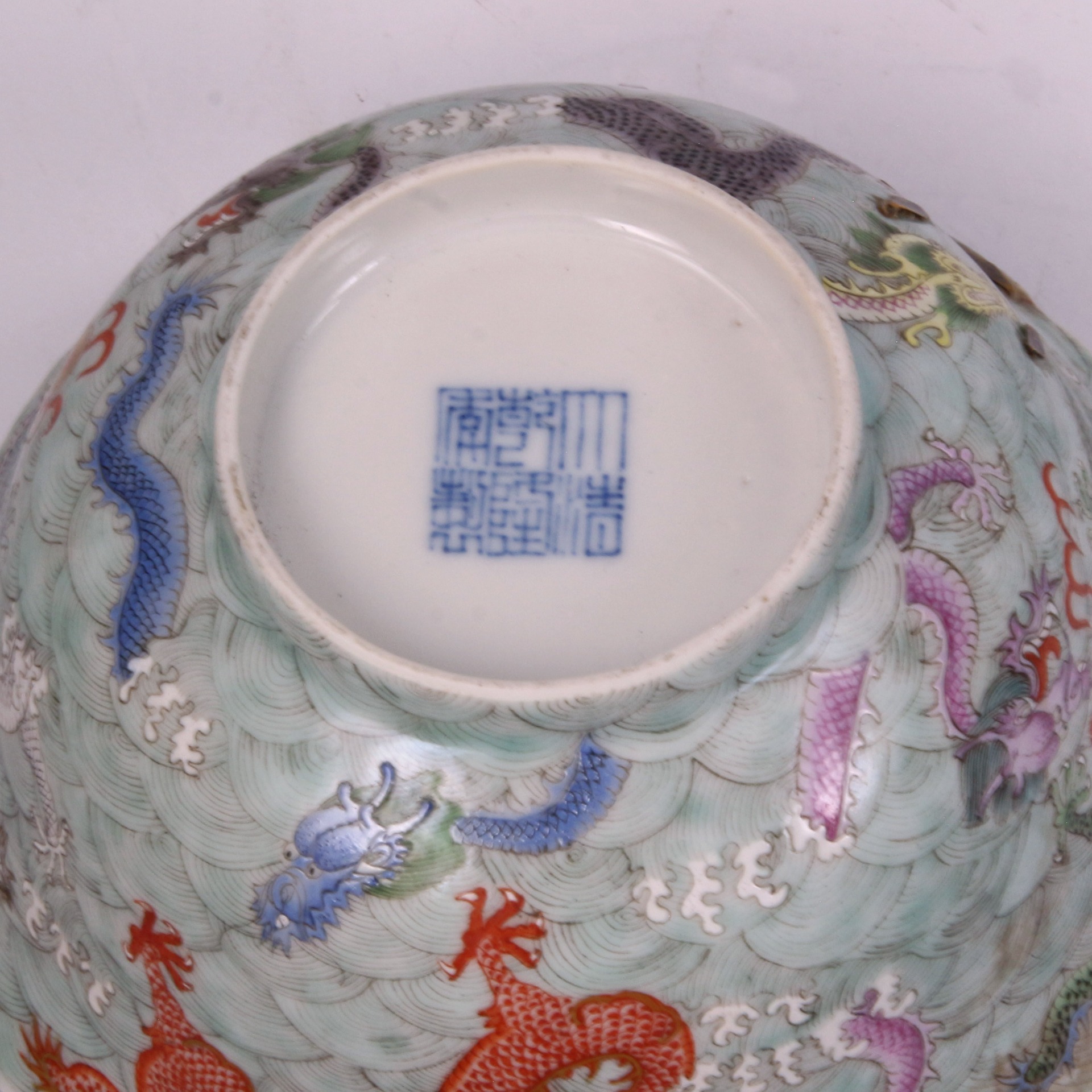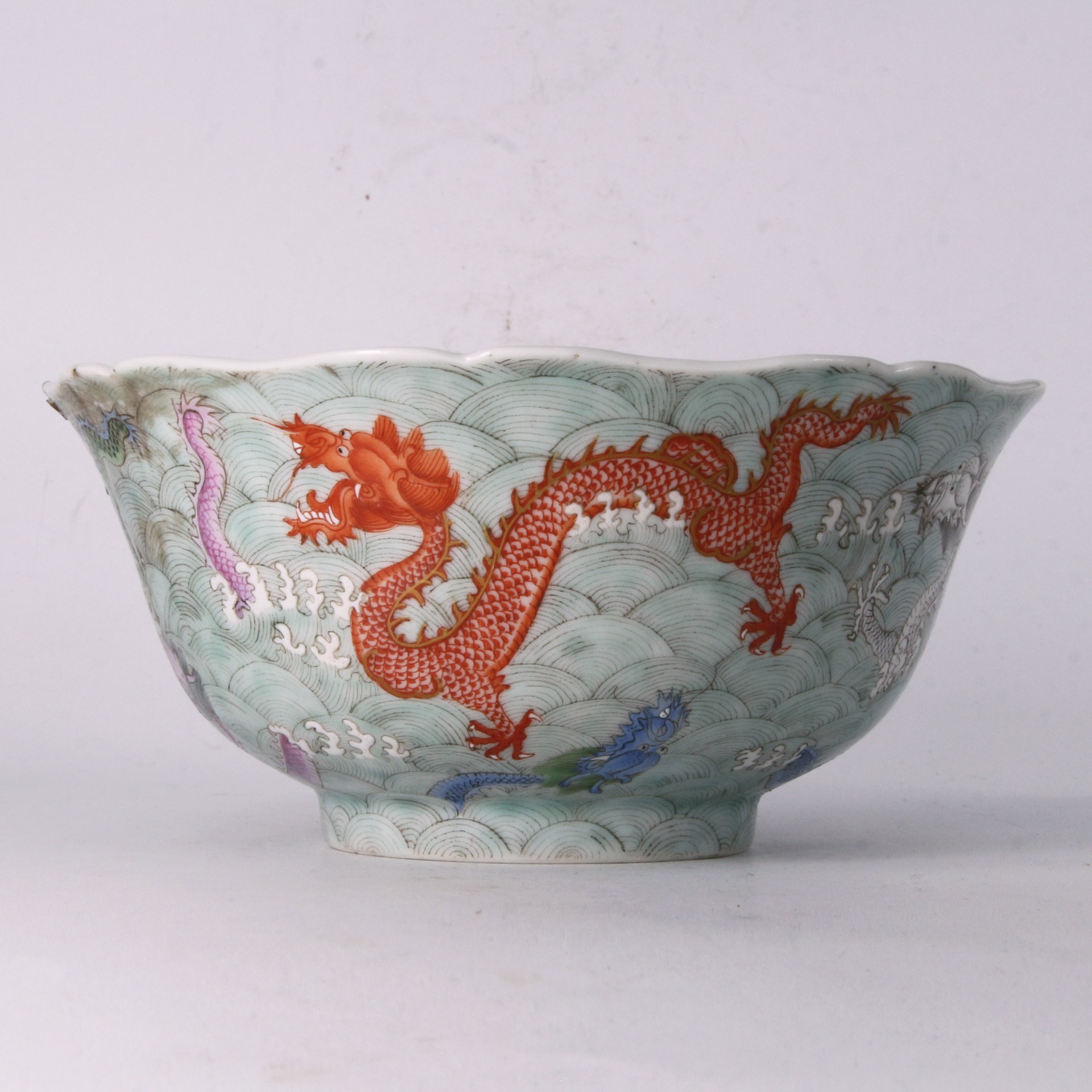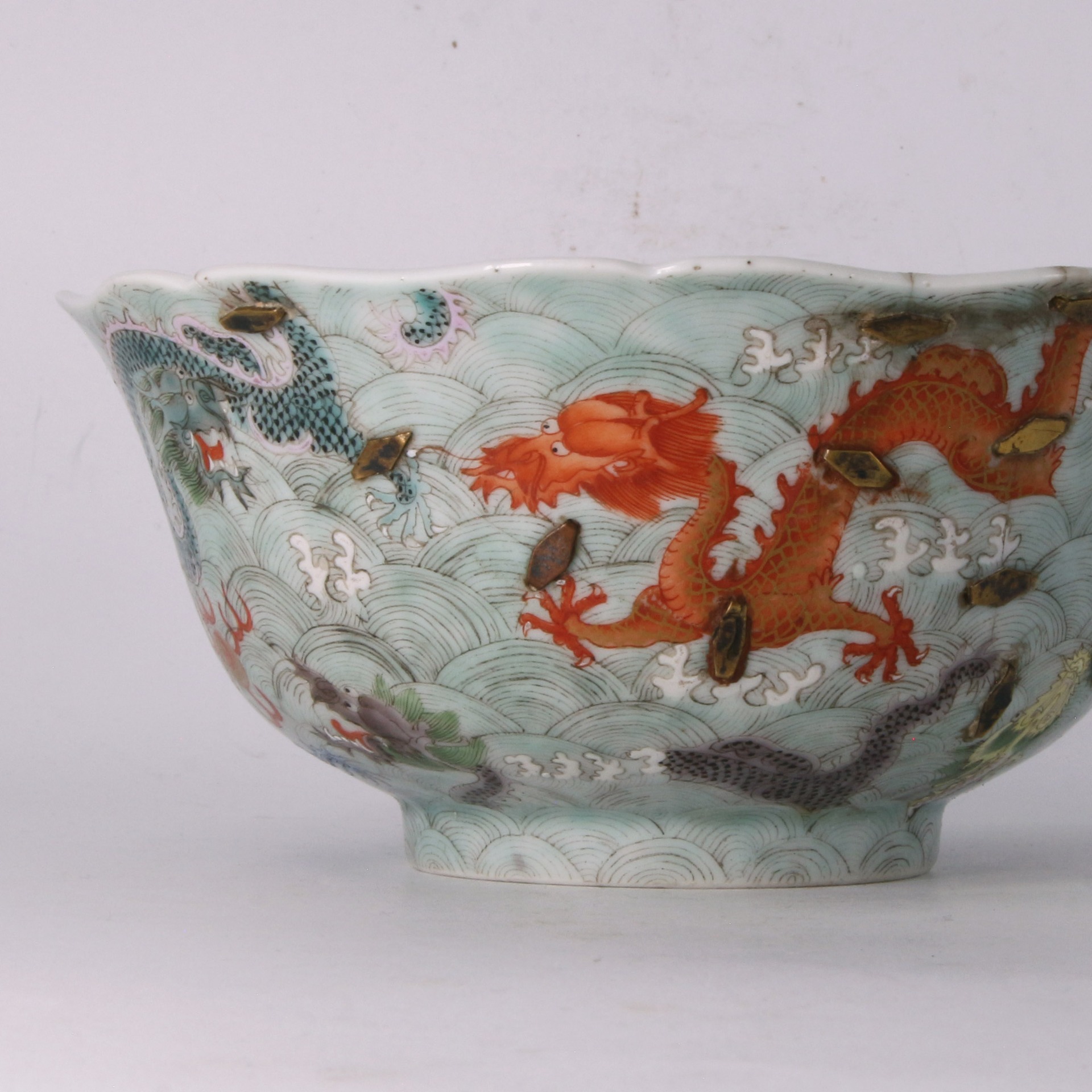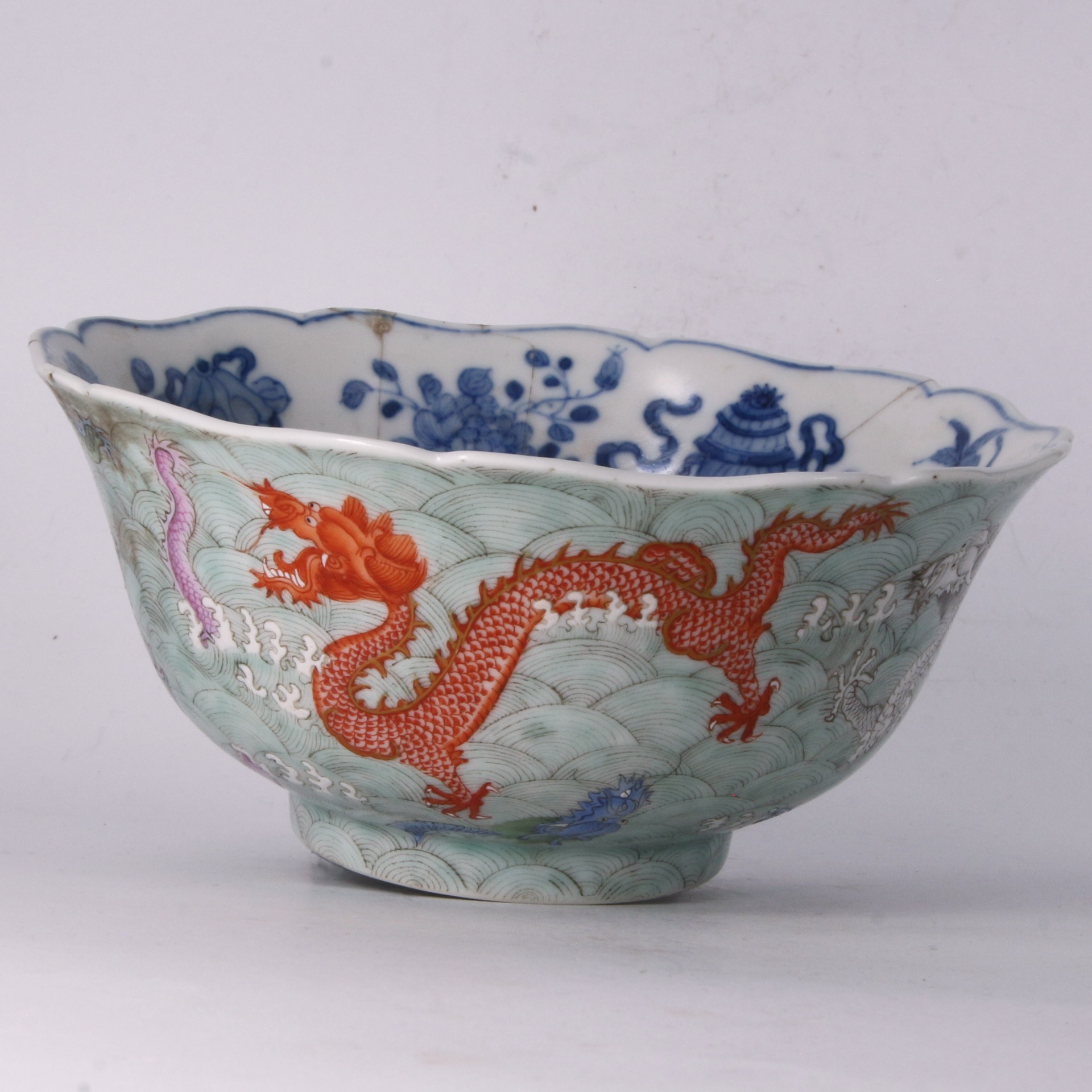 底款大清乾隆年製,此件花口碗造形優美,碗口呈波浪狀花瓣形,撇口深腹,造型玲瓏工整。外壁以粉彩繪製「九龍戲海」主題,祥龍姿態萬千,穿梭於淡綠彩繪就的洶湧波濤之中,龍身鱗片細膩,色澤層次分明,展現出威嚴且生動的皇家氣勢。碗內心則轉以青花裝飾,繪有佛家傳統的「八寶紋」(輪、螺、傘、蓋、花、罐、魚、腸),青花發色幽倩典雅,與外壁繽紛的粉彩形成內斂與華麗的視覺對比。碗身上可見細緻的「鋦補」痕跡,這種傳統修復工藝賦予了器物二次生命,更增添了歲月留下的滄桑美感。