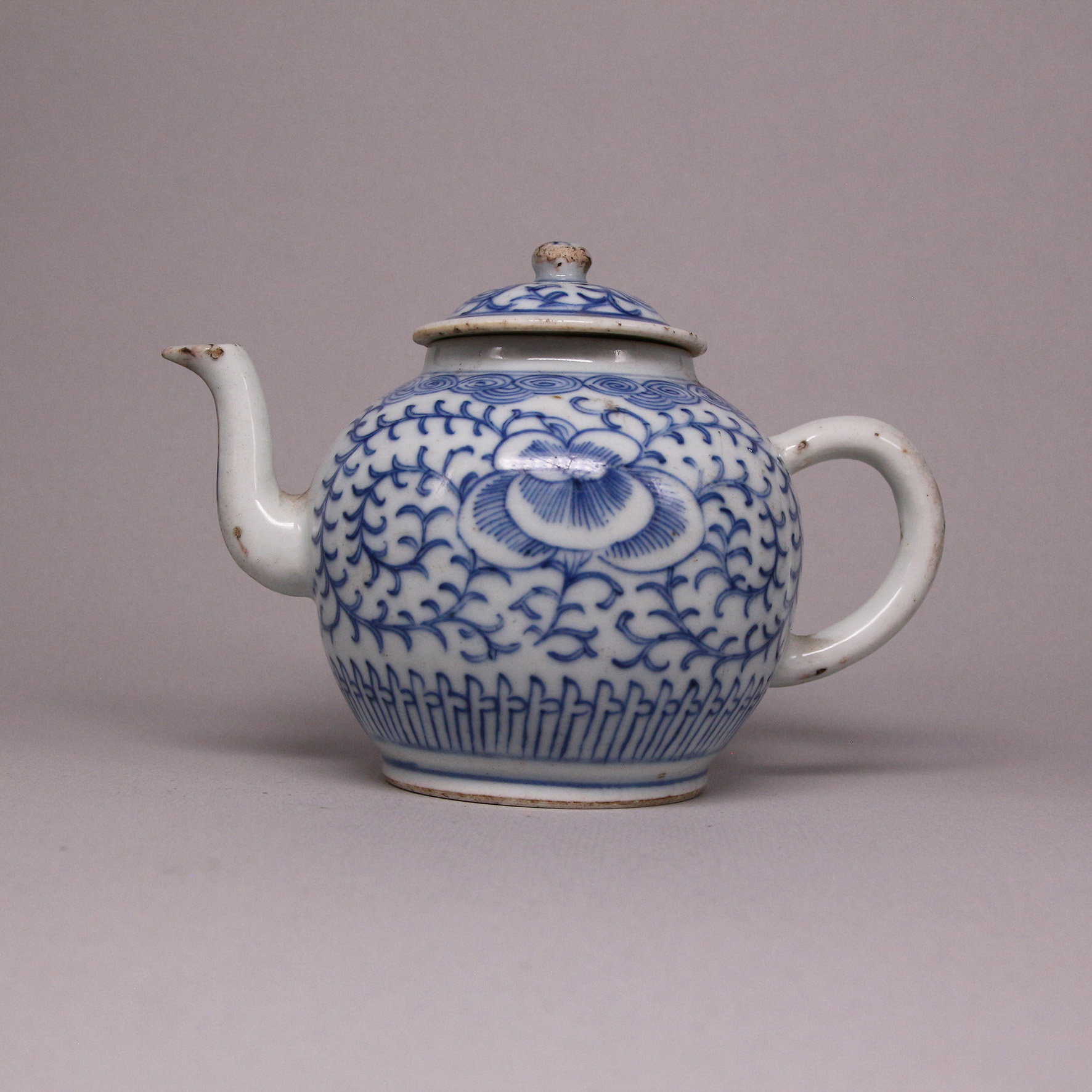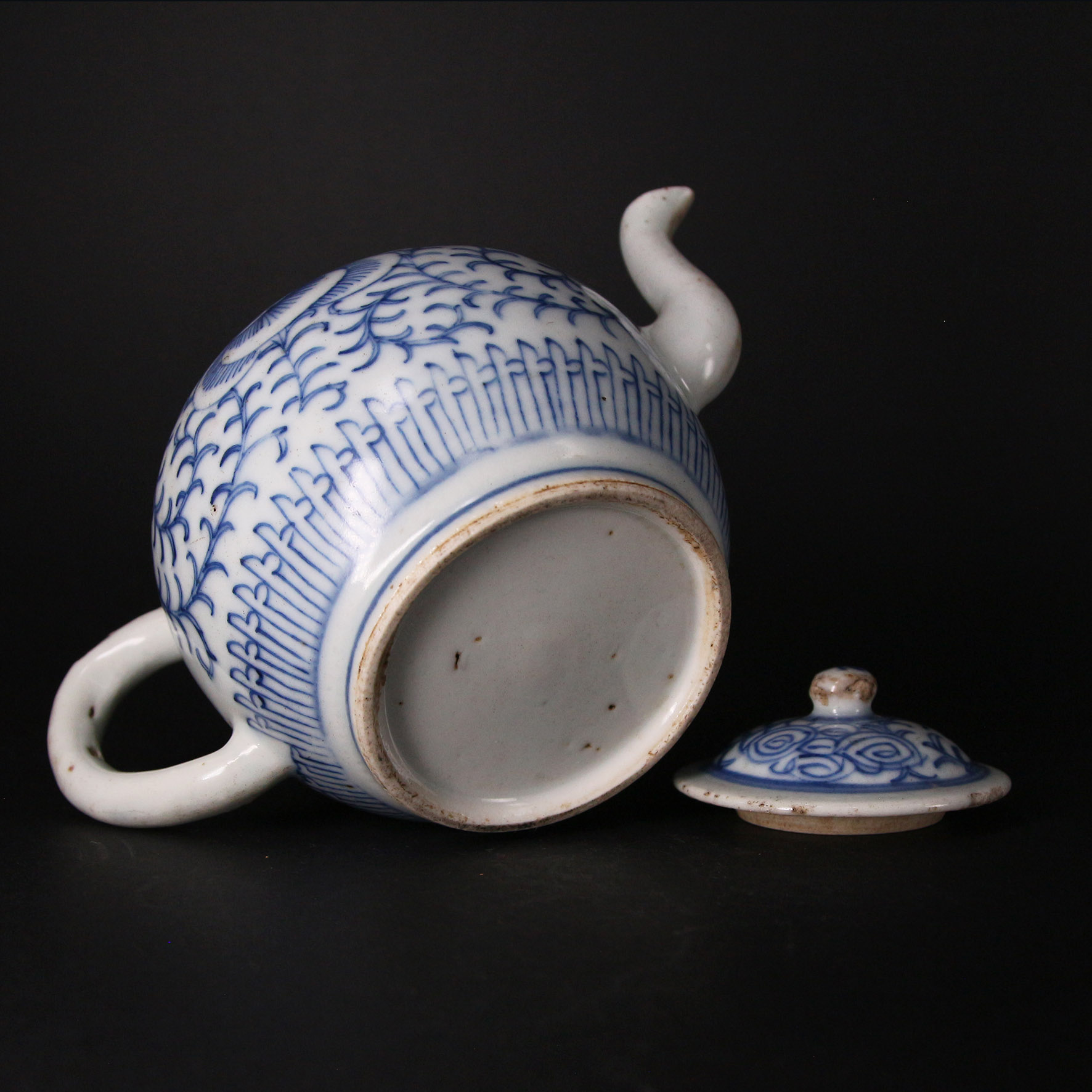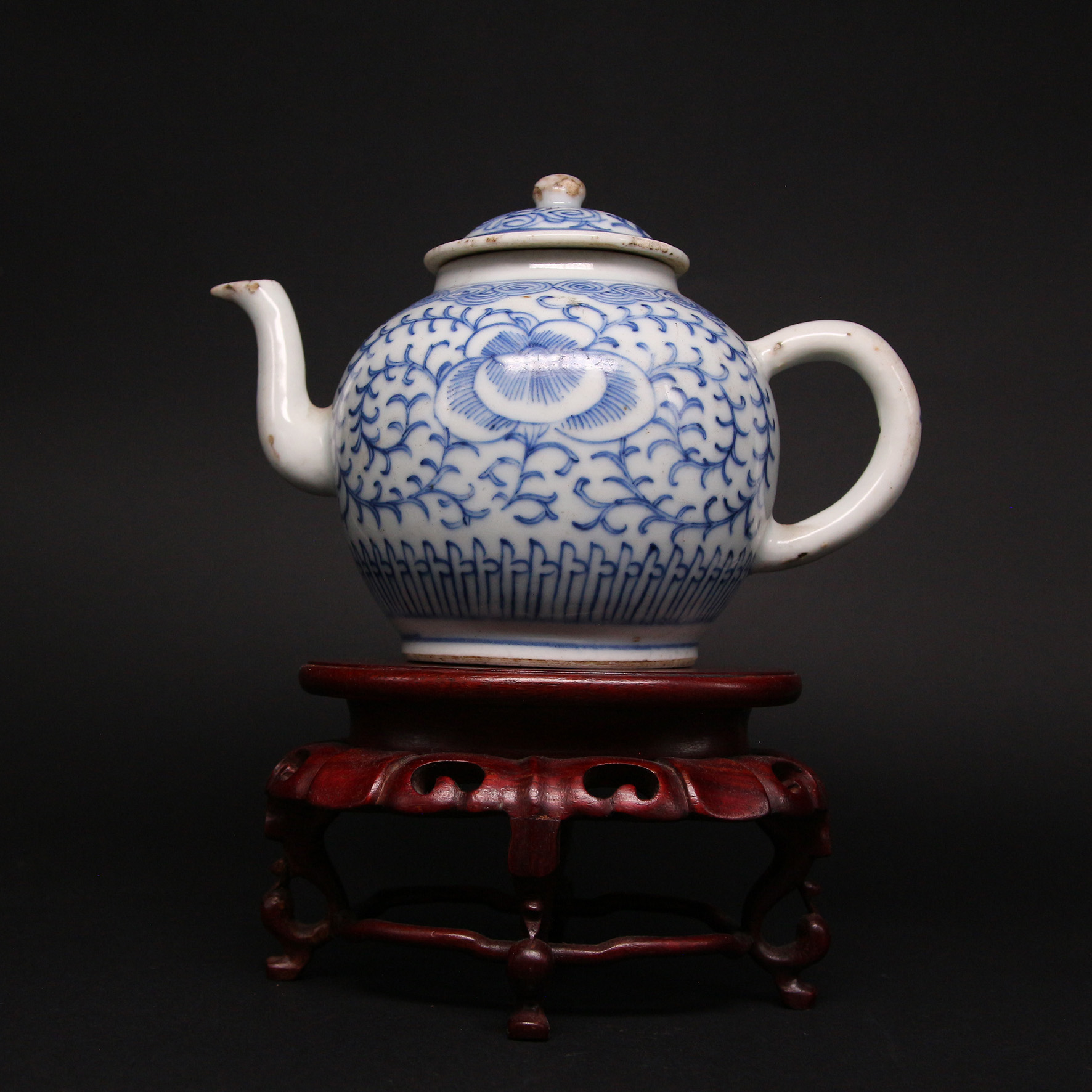 此茶壺不僅為生活用器,更蘊含文人賞器之趣。青花的清潤與蓮紋的靜美相映成趣,如同一盞清茶,入喉後回甘無盡,映照出清代工藝的成熟與內斂的審美精神。