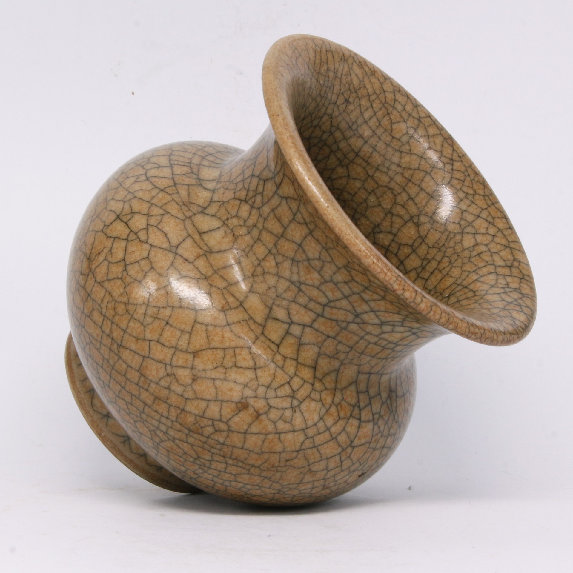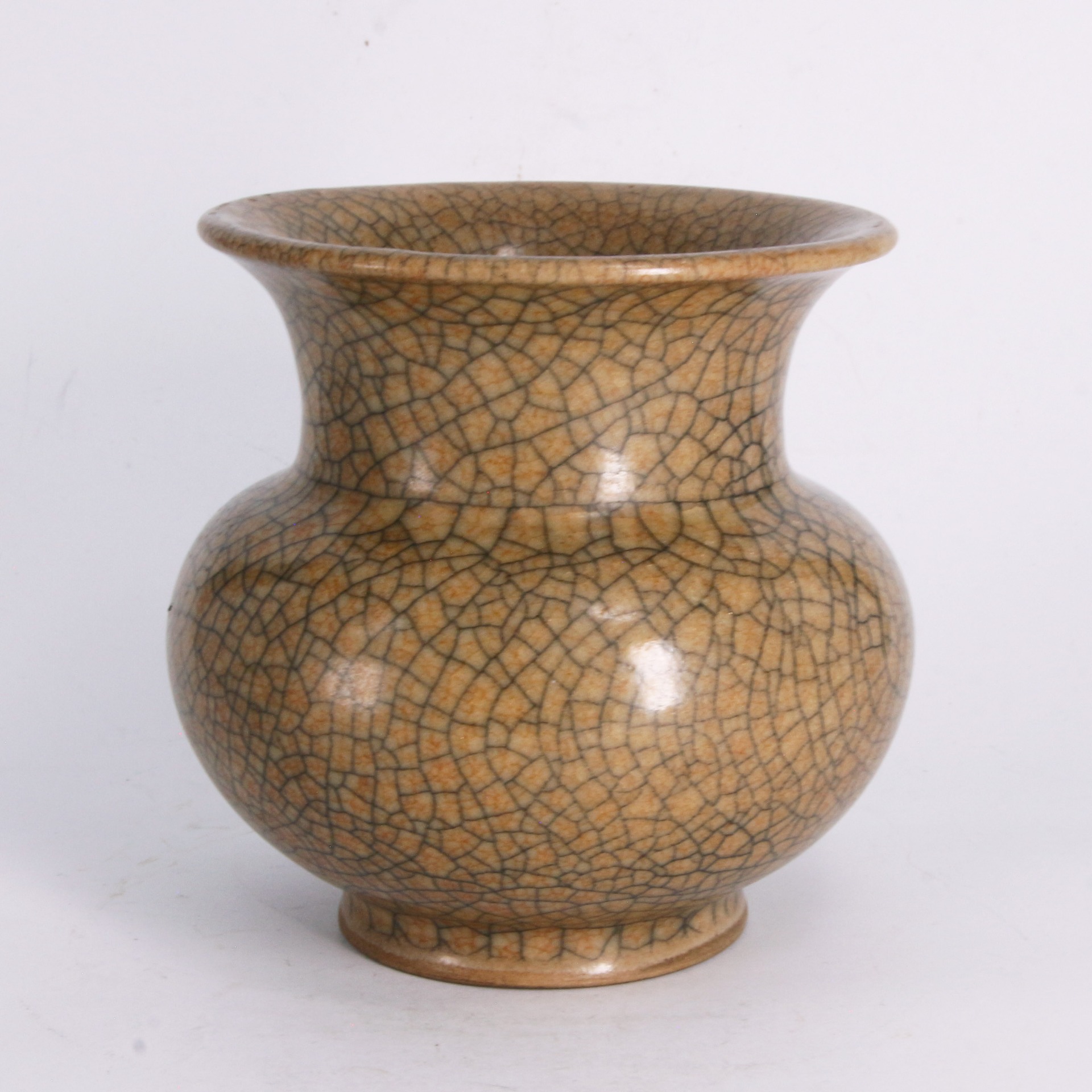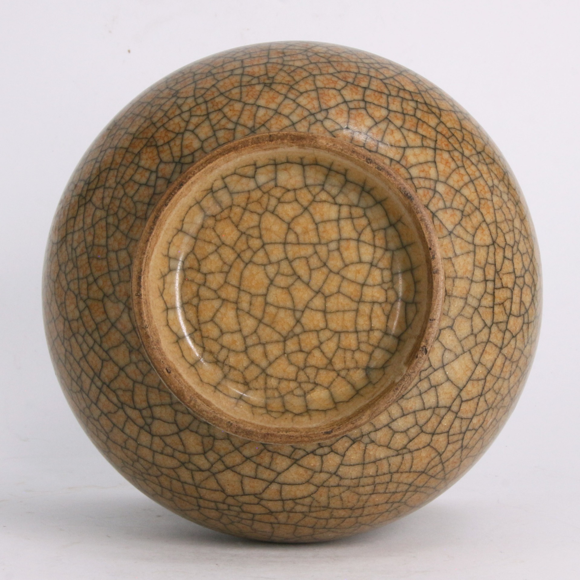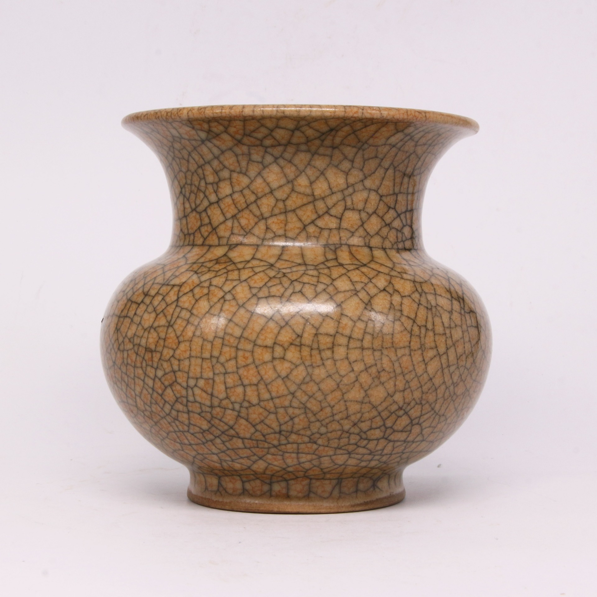 此件渣斗造型端莊大氣,撇口、束頸、鼓腹、圈足,比例勻稱且富有張力。通體施米黃色釉,釉質肥厚瑩潤,呈現如酥油般的溫潤質感。最引人注目的是其遍布全身的「百圾碎」開片紋路,紋線深淺交織,縱橫錯落,形成如碎冰開裂般的自然美感。這種開片裝飾打破了單色釉的單調,賦予器物一種歲月沉澱的靜穆與殘缺之美,是哥窯瓷器中極具代表性的藝術表現。