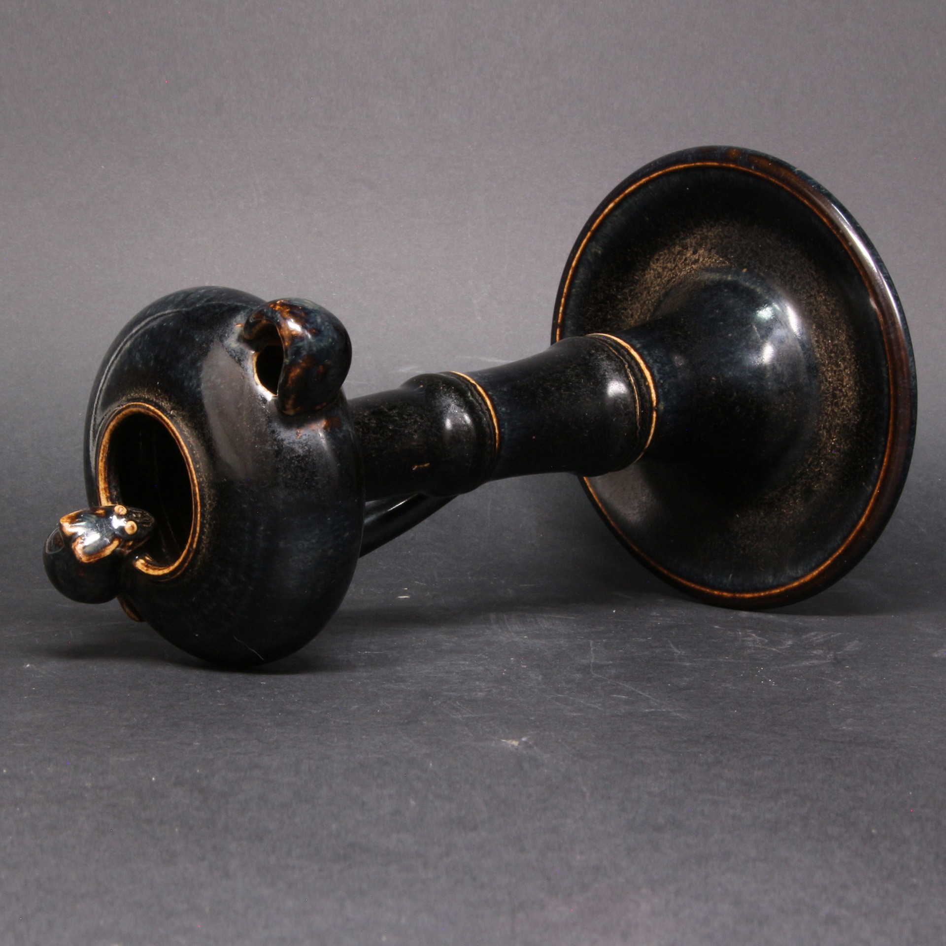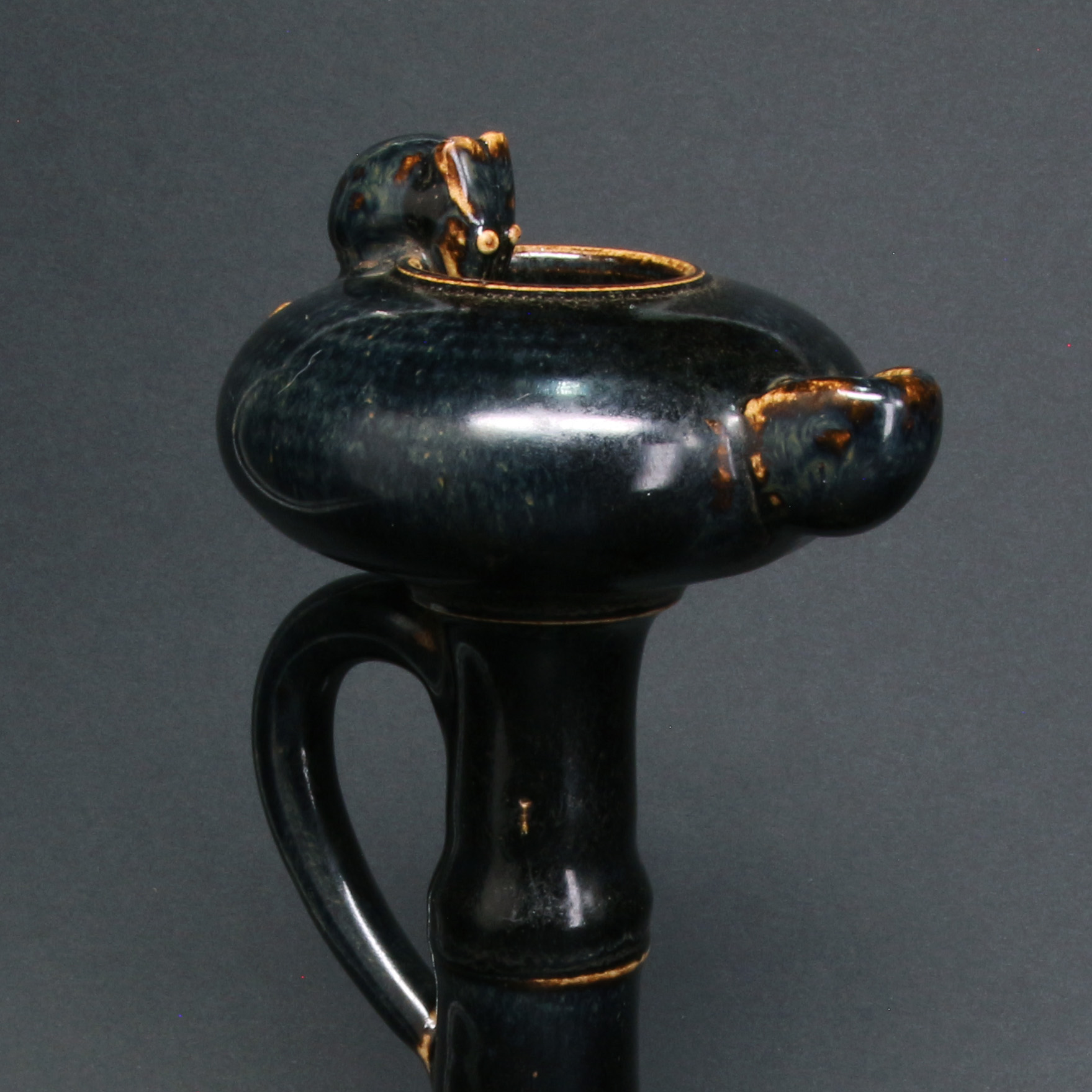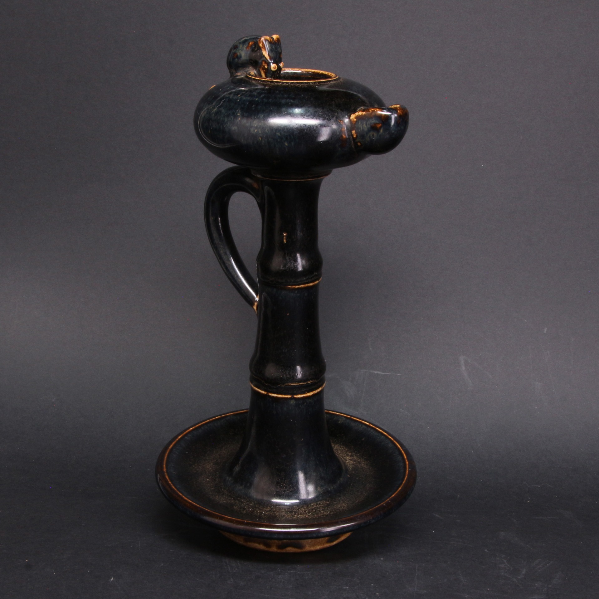 此燈盞通體施以濃郁的黑釉,釉質漆黑光亮,色澤深邃。器型設計獨具匠心,燈柱模擬竹節造型,節間稜線清晰,增強了視覺的節奏感與手持的穩固性。頂端燈盞圓潤,一側帶有傾注或出芯的流口,另一側則飾以生動的小鼠塑像。小鼠俯首於燈沿,姿態機敏傳神,賦予了冷峻黑釉器物一絲活潑的生活氣息。